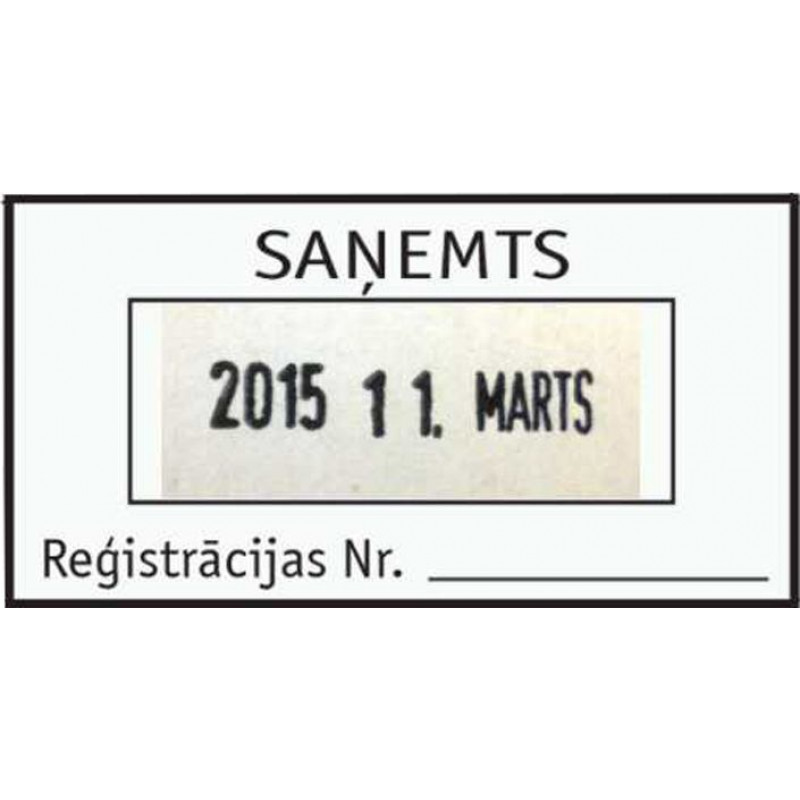 Jūsu iepirkumu grozs ir tukšs! | • Nospieduma izmērs:24x45 • Spilventiņa modelis: E/200,E/200/2 • Ieteicams rindu skaits -3 • Melns spilventiņš • Citu krāsu maiņas spilventiņi ir pieejami pēc speciāla pasūtījuma • Zīmogs atspoguļo tikai datumu, gumija ar tekstu jāpasūta atsevišķi | ||||||||||||||