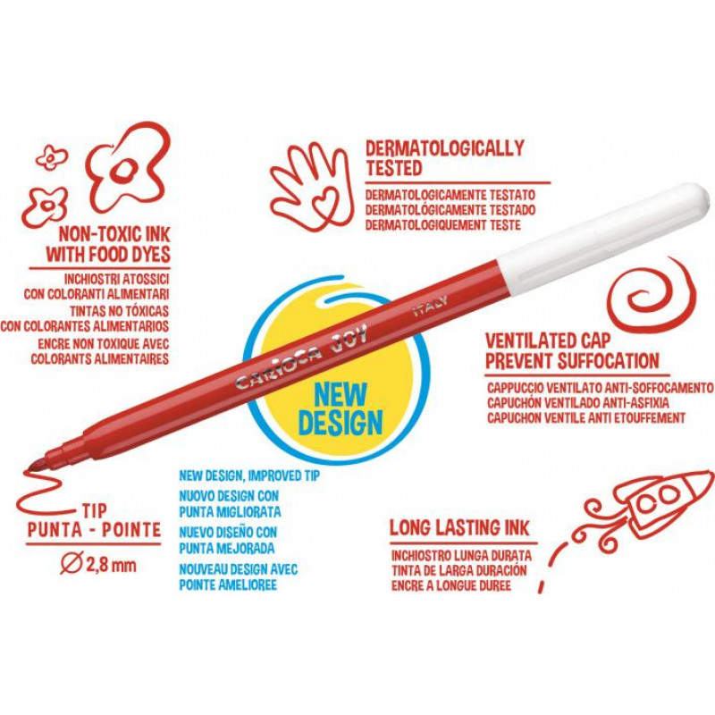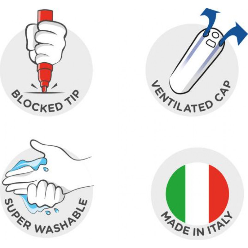 Serdeņa platums – 2 mm Raksta garums – 800 m recienizturīgs flomastera gals Tinte uz ūdens bāzes, viegli izmazgājama Plastmasas iepakojums 12 krāsu komplekts