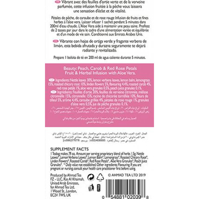 Jūsu iepirkumu grozs ir tukšs! Netikāt pie sava skaistuma miega? Neuztraucieties, mūsu Beauty Infusion palīdzēs atgūt jūsu dabisko mirdzumu. Mīksts, sulīgs persiks un patīkama alveja kopā ar citronu verbenu un ceratoniju parūpēsies par dabiski saldu un bagātinošu zāļu tēju. Lieliska tase tējas jebkurā dienas laikā, kas noteikti sniegs jums mundrumu. Lai padarītu to modernāku, mūsu tējas meistari sāk ar dinamisku nātru lapu un aromātiskās citronu verbenas pamatu. Tad mēs pievienojam kaltētus alvejas un persiku gabaliņus, kas saplūst kopā, lai radītu saldenu augļu un zāļu tēju. Alvejas želejai līdzīgais nektārs jau izsenis ir bijis iecienīts tā bagātinošo īpašību dēļ. Lai gan bieži alveja ir sastopama ādas kopšanas produktu sastāvā, tā spēj darīt brīnumus arī ķermeņa iekšienē. Grauzdētas ceratonija pupiņas un cigoriņi piešķir bagātīgu saldu fona noti, savukārt rozes un liepziedi akcentē romantiskos aromātus. Kopumā šis zeltainais maisījums ir pilns augļu aromātu un pasakainu garšu jūsu pienācīgai atsvaidzināšanai un atjaunošanai. Šajā kastītē ir 20 tējas maisiņi ar aukliņu vieglai tējas pagatavošanai tasītē vai kanniņā. Katrs maisiņš ir iepakots folijā, lai jūs varētu izbaudīt svaigu, aromātisku tēju katru pagatavošanas reizi. Izbaudiet tasi tējas mājās vakaros vai paņemiet tējas maisiņu līdzi ceļā. Tā ir lieliska tēja omas uzlabošanai dienas laikā vai, tā kā mūsu Beauty Infusion nesatur kofeīnu, varat baudīt šo nomierinošo zāļu tēju pirms gulētiešanas. | ||||