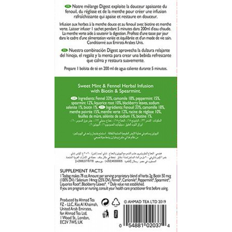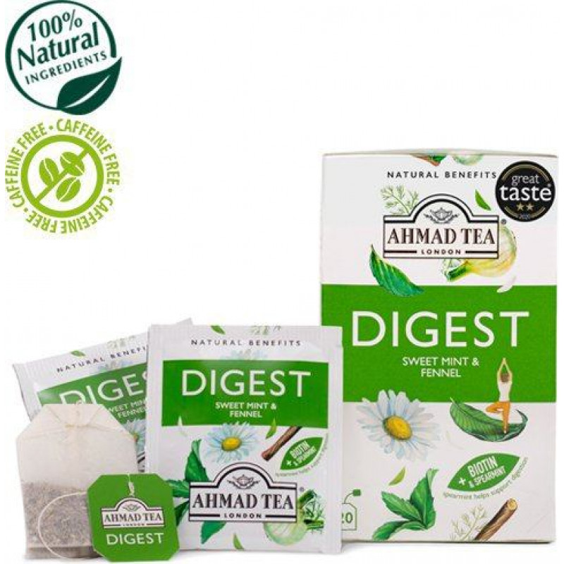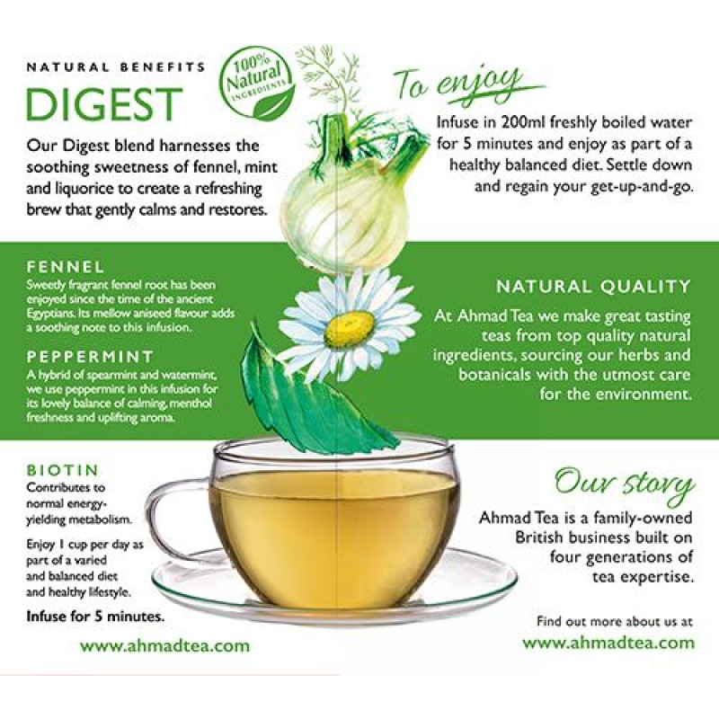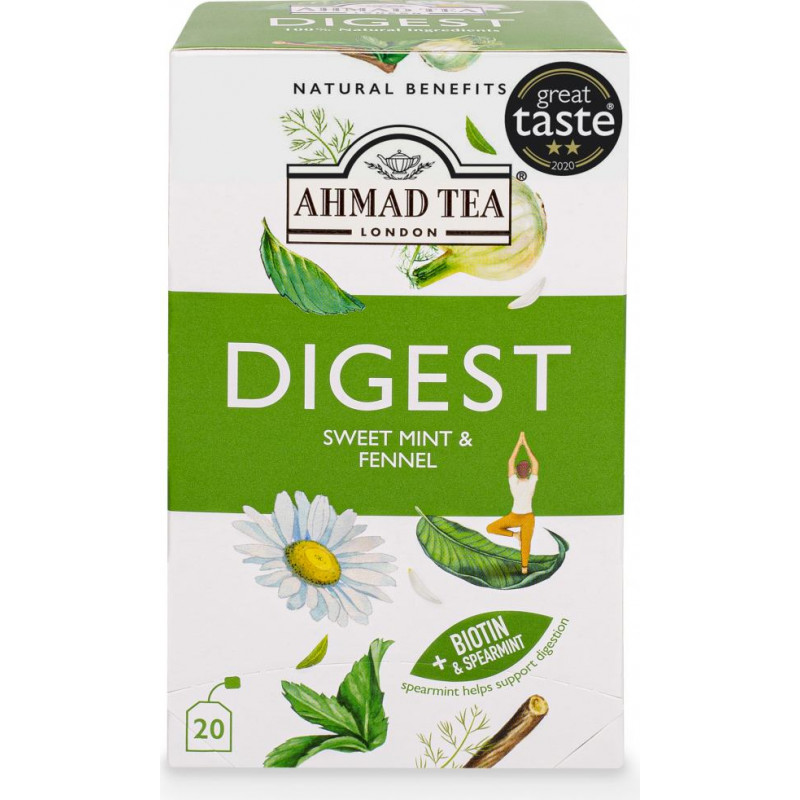 Jūsu iepirkumu grozs ir tukšs! Mūsu organismi ir neiedomājamas mašīnas, tomēr dažkārt pat vislabākajām mašīnām ir nepieciešams mazliet eļļas, lai tās darbotos bez aizķeršanās. Ahmad Tea Digest Infusion palīdz gremošanas sistēmai ar tās attīrošo piparmētras, lakricas, fenheļa un biotīna (zināms arī kā H vitamīns) maisījumu. Tā ir garda piparmētru zāļu tēja, kas nomierina un atjaunina. Šī tējas maisījuma pagatavošanai iesākumā mūsu profesionālie tējas meistari liek kopā krūzmētru un piparmētru. Piparmētra jau gadsimtiem ilgi ir izmantota kā dabisks līdzeklis gremošanas traucējumu ārstēšanai, tāpēc šeit tas ir lielisks pamats. Mēs pievienojam vēl lakricas sakni un fenheli to burvīgo saldā anīsa nošu dēļ, savukārt nedaudz kumelīšu un kazeņu lapu piešķir smalku, vasarīgu aromātu buķeti. Tomēr tieši dabiskā biotīna pievienošana ir tas, kas patiešām palielina šīs tējas spējas gremošanas sistēmas darbības uzlabošanai. Kompleksais B vitamīns, biotīns palīdz organismam pārvērst pārtiku enerģijā, kas savukārt veicina labāku vielmaiņu. Šis burvīgais maisījums sniedz tūlītēju atspirdzinājumu jūsu garšas kārpiņām, kā arī vienlaikus rūpējas par jūsu vēderu ilgākā laika posmā. Šajā kastītē ir 20 tējas maisiņi ar aukliņu vieglai tējas pagatavošanai tasītē vai kanniņā. Katrs maisiņš ir iepakots folijā, saglabājot to aromātu un nodrošinot, ka katra tējas pagatavošana sniedz pirmreizēju svaigumu. | ||||