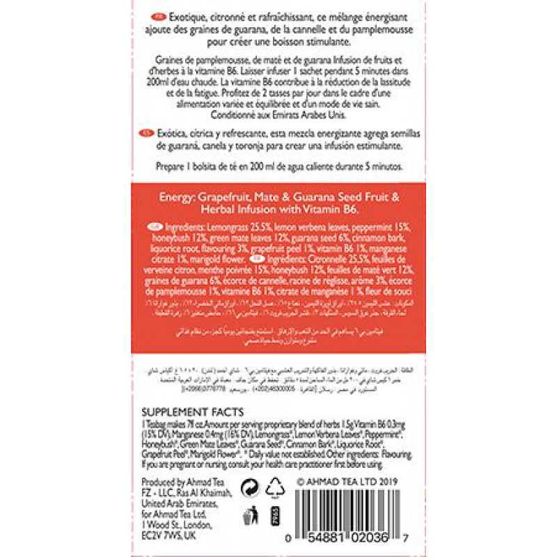 Jūsu iepirkumu grozs ir tukšs! Dažreiz, lai mēs nebūtu miegaini un kļūtu mundrāki, mums ir nepieciešama neliela palīdzība. Tieši tam ir domāta mūsu Energy Infusion. Bagātīgais kofeīnu nesaturošas matē, piparmētras, greipfrūta un citronzāles maisījums veido patiesi uzmundrinošu dzērienu. Sniedziet sev dabisku uzmundrinājumu gausās dienās ar šo “celies un dodies” augļu un zāļu tēju. Mūsu tējas meistari šo enerģijas pilno maisījumu sāk ar matē. Šī zāļu tēja ir tradicionāls karstais dzēriens Dienvidamerikā, ko iegūst no yerba mate krūma lapām. Tā svaigais, zāļu pilnais aromāts to padara par atsvaidzinošu alternatīvu melnajām tējām. Lai padarītu šo maisījumu vēl enerģiskāku, mēs pievienojam guaranas sēklas (kas satur vairāk nekā divas reizes vairāk kofeīna nekā kafijas pupiņas!) un vitamīnu B6, kas palīdz mazināt nogurumu. Aromātu līdzsvarošanai pievienojam piparmētru lapas, izteikti aromātisko citronzāli, citronu verbenu un greipfrūtu, kā arī nedaudz sildoša kanēļa. Šī oranžīga saulrieta krāsas laimes pilnā zāļu tēja jūs pārņem ar tās reibinošo citrusu un piparmētru aromātu, sniedzot enerģiju, vēl pirms esat paspējuši to iemalkot. | ||||