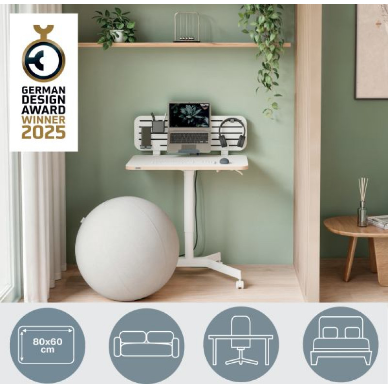 Jūsu iepirkumu grozs ir tukšs! • Kompakts un stilīgs mobilais galds darbam sēdus un stāvus, kas piemērots telpām ar ierobežotu vietu • Viegla pāreja no sēdēšanas uz stāvēšanu, lai izvairītos no sāpēm un diskomforta un veicinātu muskuļu kustību, kas pozitīvi ietekmē labsajūtu • Viegli veicama pneimatiskā augstuma regulēšana no 75 līdz 114 cm, pielāgota dažādiem izmēriem un vajadzībām • 80 x 60 x 2,5 cm darbvirsma ar maksimālo slodzi 20 kg ļauj novietot uz tās klēpjdatoru ar statīvu, tastatūru, peli un plaukstu balstu • Galds ir paredzēts elastīgai lietošanai un kā pagaidu darba vieta, lieliski piemērots mājas birojam, koplietošanas darba telpām vai sanāksmju telpām • Apvienojams ar viedajiem Leitz Ergo perforētajiem galda organizatoriem 6548 vai 6549, lai atbrīvotu vērtīgu darbvirsmas vietu (iespējams iegādāties atsevišķi) • 4 fiksējoši 360° riteņi, kas piemēroti lietošanai uz visa veida grīdām (flīzes, lamināts, koks, paklājs) Sertificējis FSC, kā arī sertificējis TÜV un GS saskaņā ar PPP 51962A standartu • 2+1 gada garantija - reģistrējieties, lai iegūtu papildu gadu • Viegli saliekams saskaņā ar pievienotajām instrukcijām • Izveidojiet sev individuālu un ērtu darba vidi, lai ar Leitz Ergo JUSTOS LABI | ||||